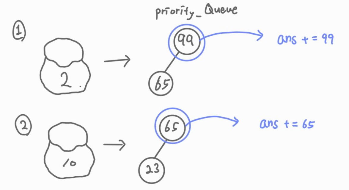 두번째 가방에서도 Queue에다가 계속 집어넣으면서 배열의 끝을 만나거나 또는 담을 수 없는 보석의 무게가 등장하게 되면 큐의 루트노드를 pop() 하면서 결과값에 반영한다.