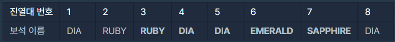 ["DIA", "RUBY", "RUBY", "DIA", "DIA", "EMERALD", "SAPPHIRE", "DIA"] [3, 7]