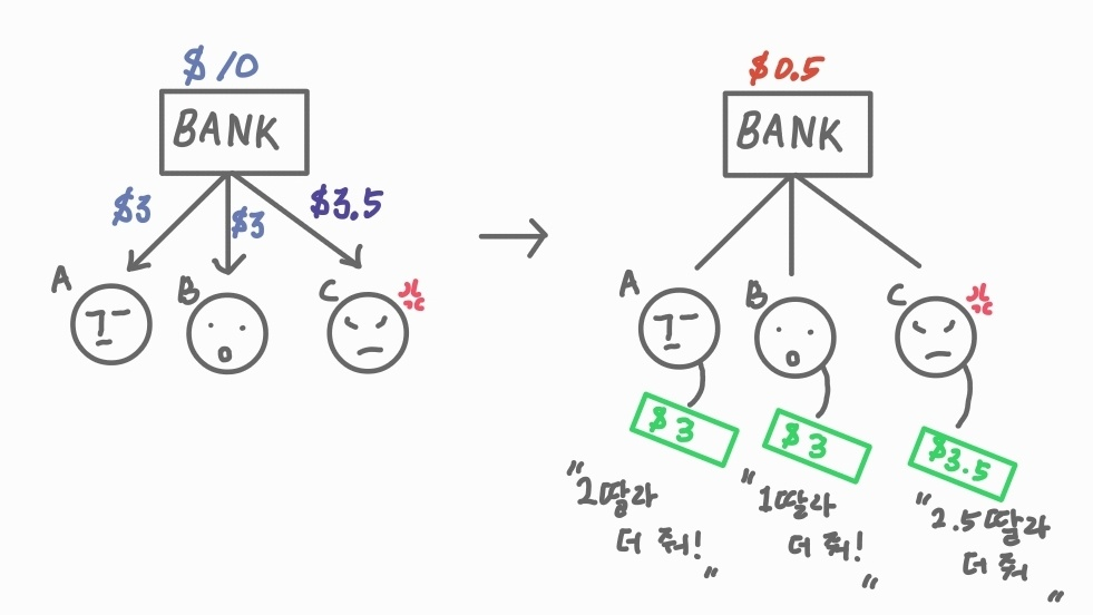 만약 처음에 은행이 A와 B한테는 "3딸라"를 주고 C는 계속 화를 내니까 C한테는 "3.5딸라"를 줬다고 가정해봐요.