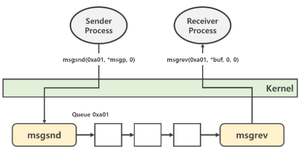 위의 그림을 보시면 각 프로세스들이 커널에 있는 메세지 큐 공간으로 자원을 던져주는 것이 보일겁니다!