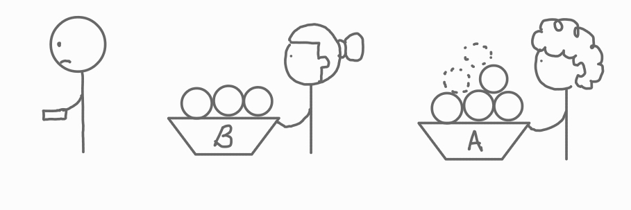 A : 70 -> B : 20 -> 나 : 0 -> A : 40 -> B : 0 -> A : 10 -> 0 이렇게 끝나겠네요!!