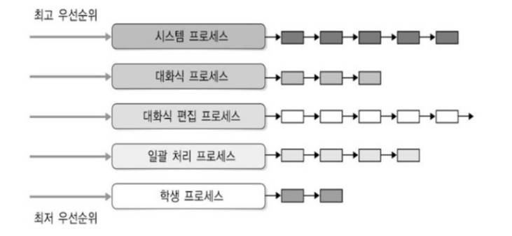 이렇게 큐를 분리하면 프로세스의 우선순위와 작업 형태를 고려하여 스케줄링을 할 수 있는거죠~