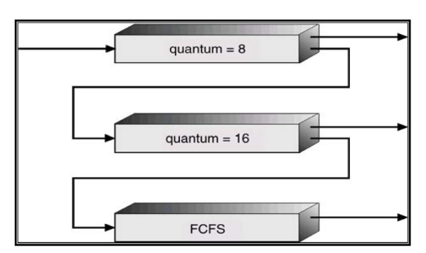 결국 다단계 피드백 큐 스케줄링에서 마지막 큐에 있는 (우선순위가 가장 낮은) 프로세스는 무한대의 타임 슬라이스를 얻게 돼요. 무한대의 타임 퀀텀을 얻는다는 것은 프로세스가 실행상태가 들어가면 cpu 를 빼앗기지 않고 끝까지 작업을 마친다는 의미입니다.