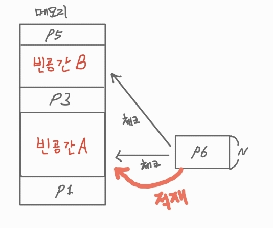 위에 보시면 빈공간 A는 프로그램 P6을 적재할 수 있는 충분한 크기를 가지고 있네요ㅎㅎ