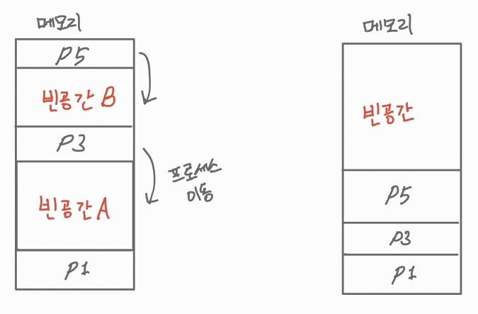 프로세스가 종료된 자리에 생겨난 가용공간을 없애기 위해서 적재된 프로세스들을 한쪽으로 몰고 가용 공간들을 다른 한쪽으로 모아서 하나의 큰 가용 공간으로 만드는거에요!
