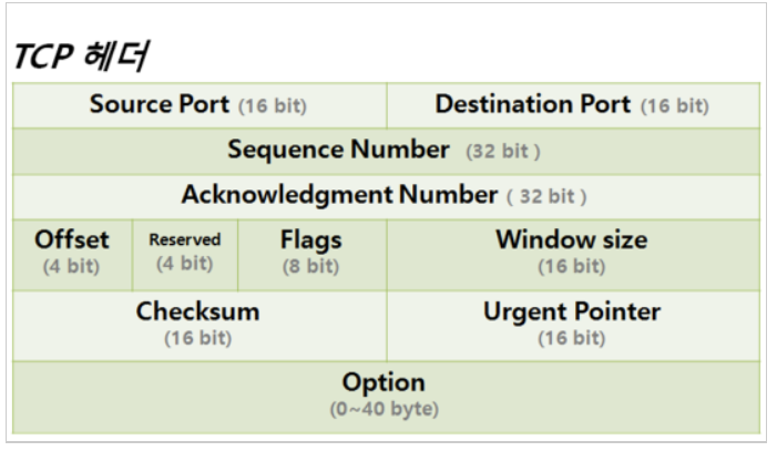 | 옵션 ( Option) | 0~40byte | 최대 세그먼트 사이즈 지정 등 추가적인 옵션이 있을 경우 표시. |