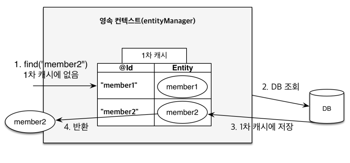 현재 영속 컨텍스트는 "member1" 을 PK 로 가지는 객체 하나가 들어있다. 여기서 "member2" 를 PK 로 가지는 객체를 들고 오고 싶다. 하지만 현재 영속 컨텍스트는 "member2"를 PK 로 가지는 객체는 없다.