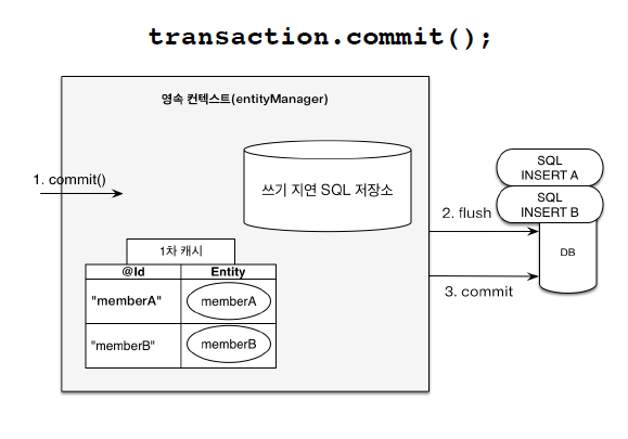 그리고 트랜잭션 commit() 을 수행하면 그때서야 쓰기 지연 SQL 저장소에 있던 쿼리문들이 DB로 날려진다.