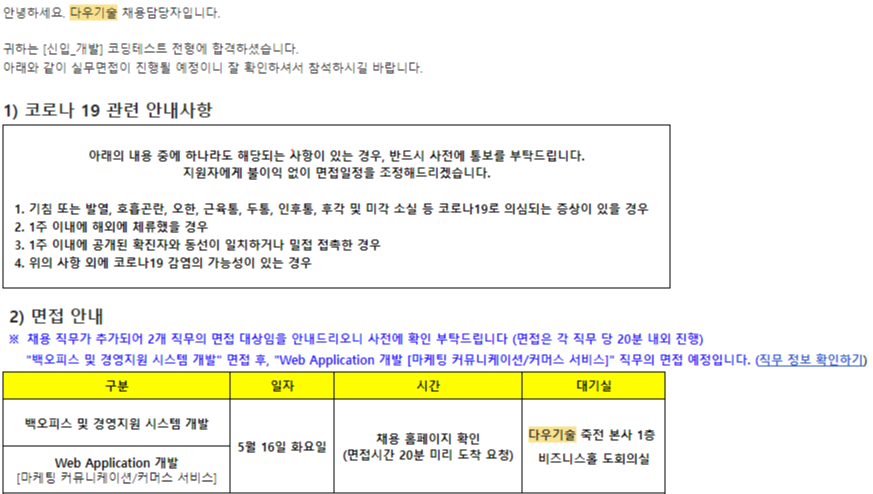 "채용 직무가 추가되어 2개 직무의 면접 대상임을 안내드리오니 사전에 확인 부탁드립니다."