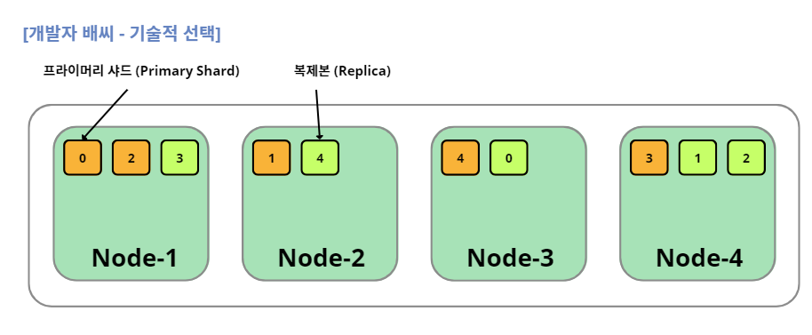 예를 들어, 노드의 개수 4, 샤드의 개수 5, replica의 개수 1이라면 아래와 같이 샤드와 replica가 분산되서 저장된다.