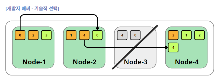 예를 들어, 아래 그림처럼 3번 노드가 죽으면 primary shard 4번이랑 replica 0을 잃게 된다. 하지만 primary shard 4는 노드2에 , replica 0은 노드 2에 존재하기 때문에 데이터를 대체할 수 있다.