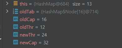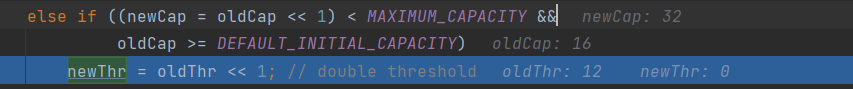 여기서 newCap에 oldCap(16)의 left shift 연산을 통해서 2배의 값을 가지게 된다. 동일하게 threshold에도 같은 방식으로 2배 늘려주는 것을 볼 수 있다.