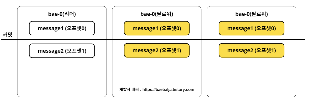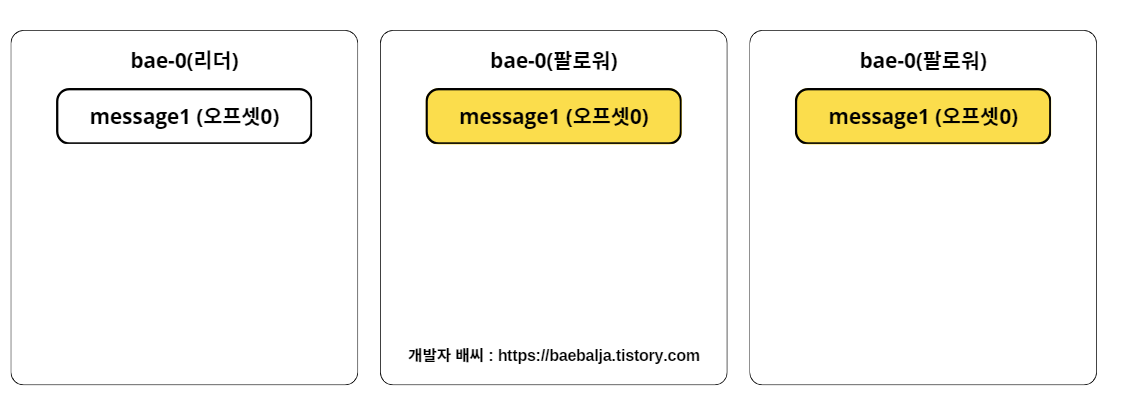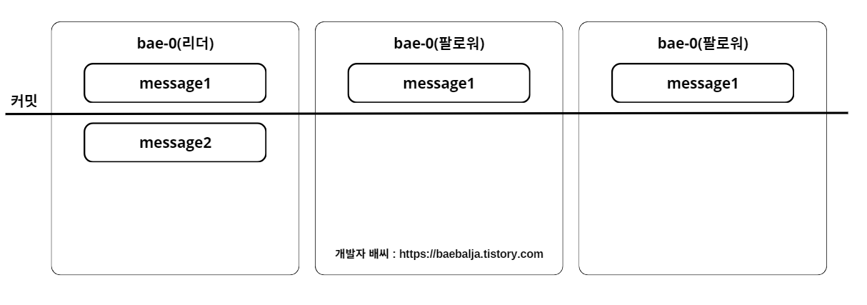 자, 이제는 각 파티션에서 어떻게 메시지들을 리플리케이션하는지 궁금할 때가 되었다. 위의 그림은 bae 토픽에 1개의 파티션과 3개의 리플리케이션 팩터를 갖고 있다. 현재 리더 파티션에서 message1에 대한 메시지를 갖고 있는 상태이며 다른 팔로워들은 메시지를 리플리케이션 하기 전 상태라고 가정하자.
