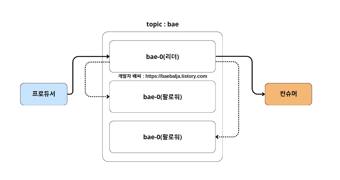 위의 그림에서 bae 토픽의 파티션 수는 하나고 리플리케이션 팩터 수는 3이다.