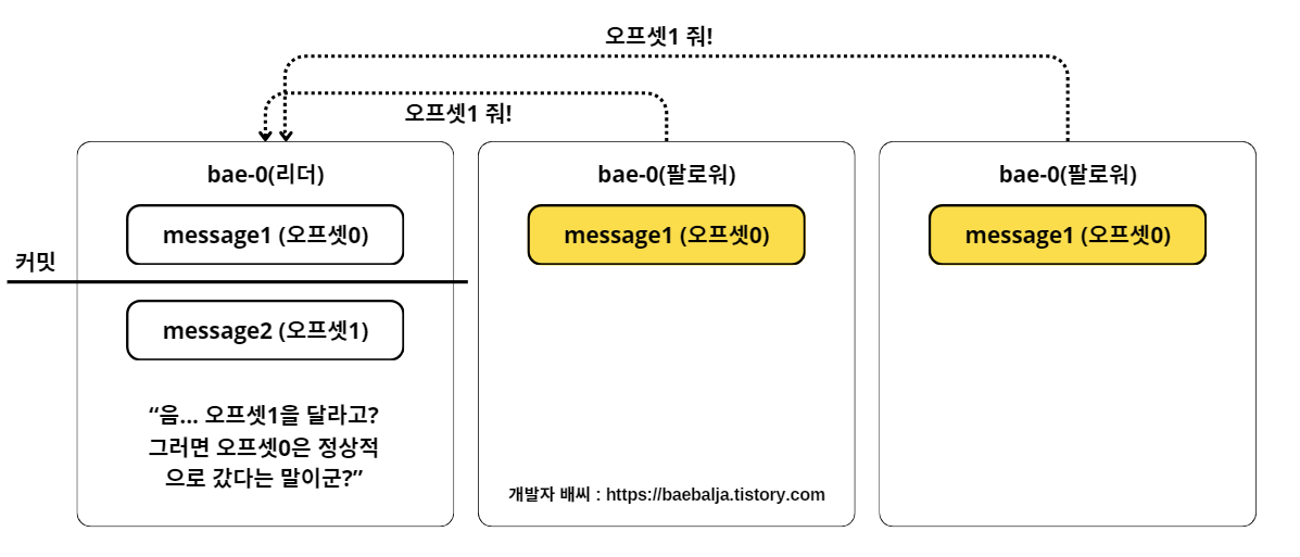 만약, 특정 팔로워가 오프셋 0번에 대한 리플리케이션을 성공하지 못했다면, 오프셋 0번에 대한 리플리케이션 요청을 보내게 되는 것이다. 즉, 팔로워들이 보내는 리플리케이션 요청의 오프셋을 보고, 팔로워들이 어느 위치의 오프셋까지 리플리케이션을 성공했는지 인지할 수 있다.