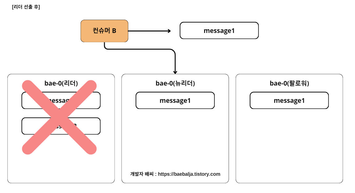 컨슈머 A가 message2를 읽자마자 리더에 장애가 발생했다. 그러면 ISR 그룹 내에 새로운 리더를 할당할 것이다. 위의 그림처럼 뉴리더가 생성이 되고 컨슈머 B가 새로운 리더의 메세지를 읽어오게된다. 그렇다면 컨슈머 A와 컨슈머 B는 동일한 토픽에 컨슘했음에도 메시지가 일치하지 않게 되는 문제점이 발생한다.