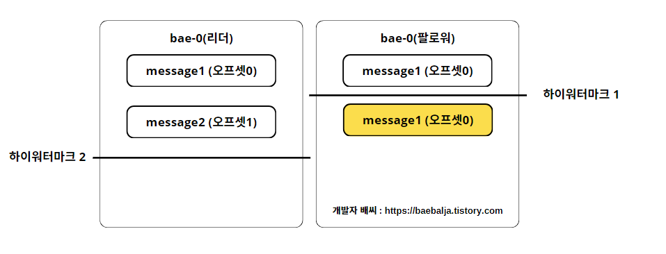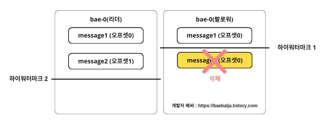 | 3. 팔로워는 자신의 하이워터마크보다 높은 1번 오프셋의 message2를 삭제하지 않고, 리더의 응답을 확인한 후 message2까지 자신의 하이워터마크를 상향 조정한다. |