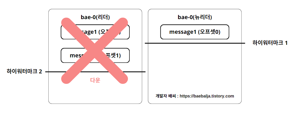 리더가 예상치 못한 장애로 다운되면서 팔로워가 새로운 리더로 승격되었을 때 리더에포크를 적용하지 않는 경우에는 팔로워가 message2를 가지고 있음에도 복구 과정에서 하이워터마크보다 높은 메시지를 삭제했었지만 리더에포크를 활용하게 되면 삭제 동작을 하기 전에 리더에포크 요청과 응답 과정을 통해 팔로워의 하이워터마크를 올리면서 메시지 손실을 발생하지 않게 된다.