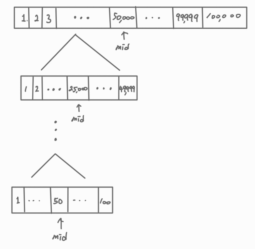 즉, 첫 중간값은 50,000이 되고 두번째 중간값은 25,000 ... 이런식으로 계속 분할하다 보면