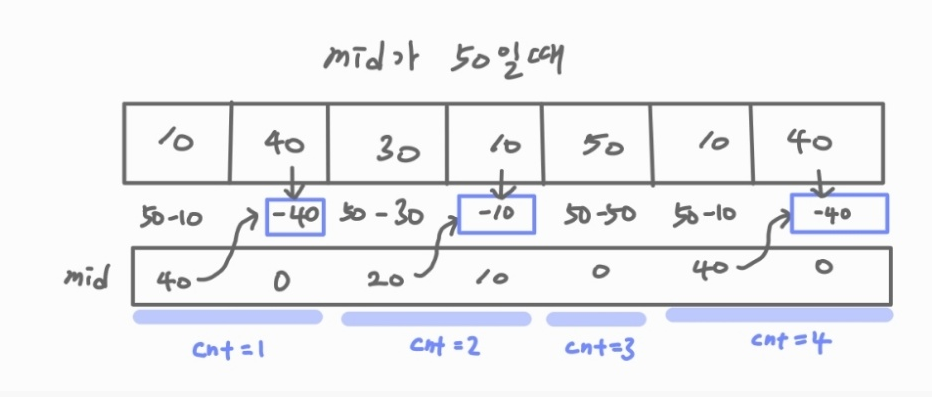 현재 mid 값인 50으로 현우가 날마다 사용하려고 정한 돈을 계속해서 빼주고 충당이 안된다면 다시 mid값을 초기화 시켜서 반복한다. mid값을 다시 초기화 시키는 작업에서 카운팅을 해주는데 이 값으로 m값과 비교하면 된다.